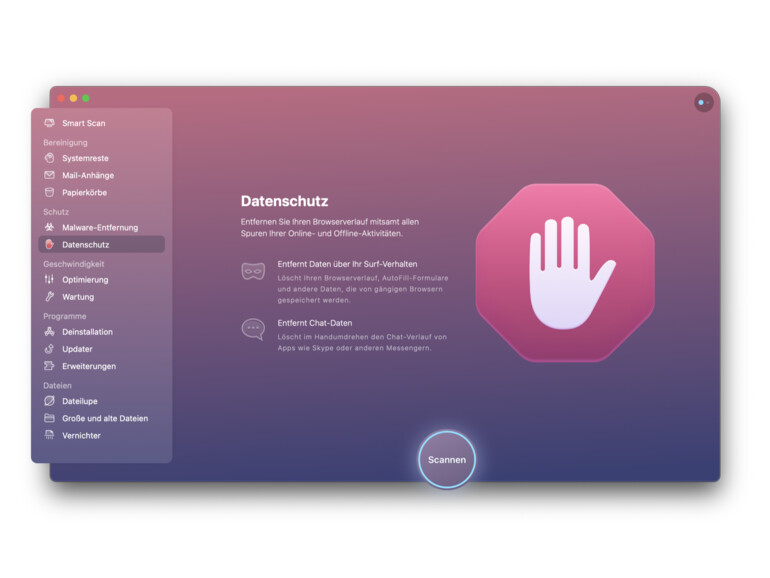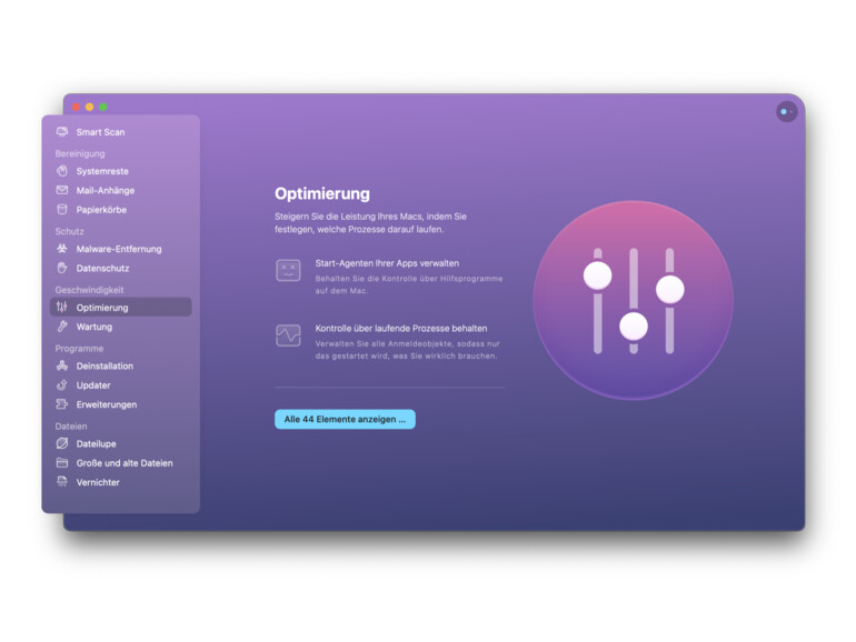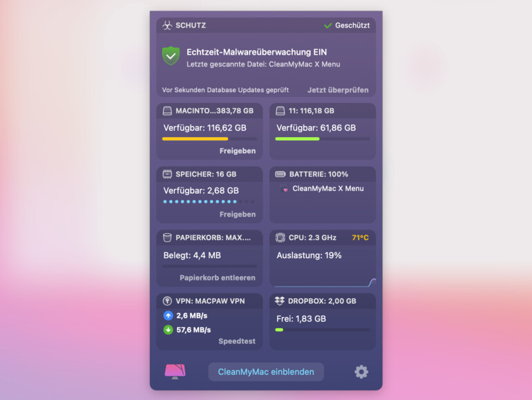 Darüber hinaus kannst du mit dem Programm die Leistung deines Computers überwachen lassen, Malware entfernen, aber auch manuell deinen RAM-Speicher leeren. CleanMyMac X übernimmt einen CPU-Temperatur-Check, führt WLAN-Diagnosen durch und scannt deinen Mac auf Viren. Schneller wird dein Mac mit der Software ebenfalls dadurch, dass Hintergrundaktivitäten deaktiviert werden, von denen du gar nichts wissen kannst.