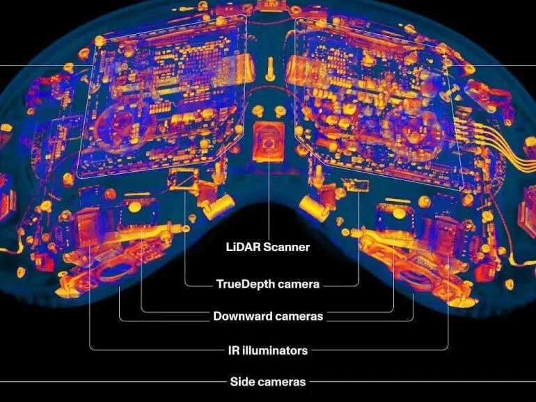 Das Headset ist vollgepackt mit einer beeindruckenden Anzahl von Bausteinen, darunter Infrarotkameras für die Augenerkennung, ein LiDAR-Scanner, ein TrueDepth-Kamerasystem für Face ID, nach unten gerichtete Kameras für die Handerkennung und MEMS-Mikrofone für die Sprachsteuerung. Die kompakte Anordnung dieser Komponenten ist ein Beweis für die Designkompetenz von Apple.