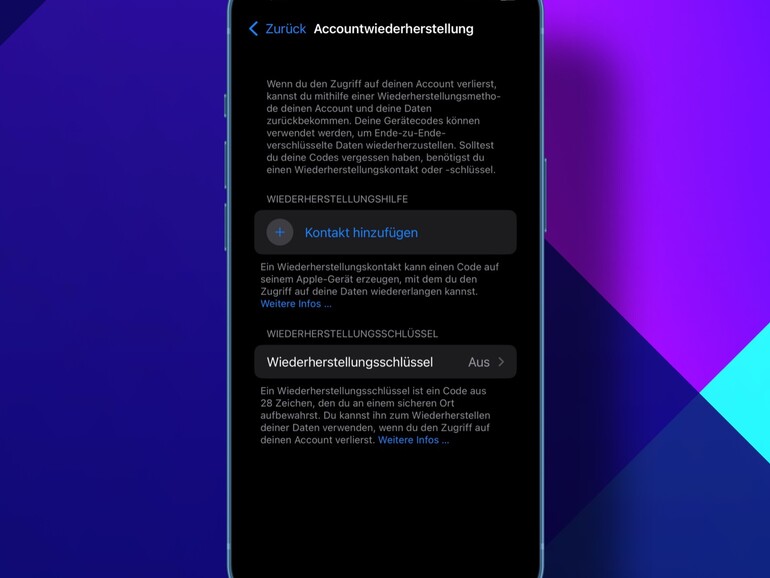 Außerdem kann man einen Wiederherstellungskontakt hinzufügen, z. B. einen Freund oder ein Familienmitglied, dessen Geräte autorisiert sind, einen Wiederherstellungscode für Ihre Geräte zu erhalten.
