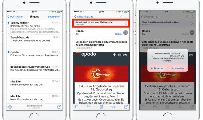 Hand auf’s Herz - Newsletter können nervige Ausmaße erreichen, sodass man sich gerne von ihnen abmelden möchte. Nicht immer sieht man gleich den entsprechenden Link dafür. Die Mail-App von iOS 10 erkennt diesen jedoch und zeigt Ihnen die entsprechende Option gleich nach dem Öffnen der E-Mail am oberen Rand an. Ein Tipp darauf, noch einen auf die Bestätigung und schon sind Sie von dem unerwünschten Newsletter abgemeldet.