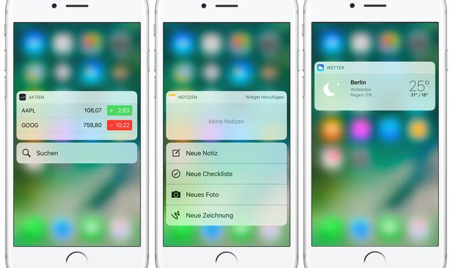 Ein weiteres Feature über das Sie nur mit einen 3D-Touch-fähigen iPhone stolpern können, sind die Quick Action Widgets. Drücken Sie etwa fester auf ein App-Icon im Home-Bildschirm, um die Quick Actions aufzurufen. Je nach App kann sich dahinter auch ein zusätzliches Widget verbergen. Diese geben Ihnen Auskunft über verschiedene App-Inhalte, beispielsweise das Wetter, zuletzt benutzte Kontakte oder anstehende Termine. Diese Widgets können auch in der üblichen Widget-Ansicht verwendet werden. Sollte das Widget dort noch nicht angelegt sein, dann können Sie es über einen Fingertipp auf „Widget hinzufügen“ übernehmen.