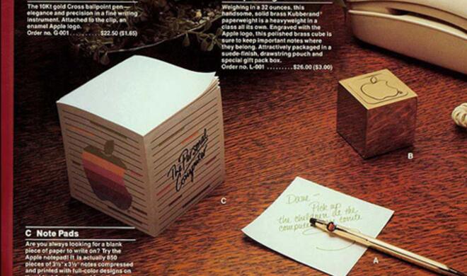 Im Jahr 1983 gab es tatsächlich einen Katalog mit Merchandise-Artikeln direkt von Apple. In diesem fanden man allerlei Kuriositäten. Weniger merkwürdig ging es allerdings auf der aktuellen Seite zu. Hier wirbt Apple für einen schicken Briefbeschwerer, einen vergoldeten Kugelschreiber sowie einen einen kunstvoll-designten Stapel mit Notizzetteln. Etwas ähnliches gibt es auch heute noch, wie die nächste Seite zeigt.