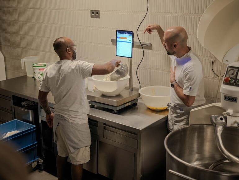 Die Eigenentwicklung Kalibre, programmiert von Vinzenz Brantner, dem Bruder des Bäckermeisters, führt durch Rezepte und bildet den Produktionsplan ab. Das genaue Einwiegen der Zutaten ist entscheidend für die Qualität des Endprodukts. Auf dem iPad neben der via Bluetooth verbundenen Waage steht in großen Zahlen, was und wie viel als Nächstes in die Teigmaschine kommt. Erst dann, wenn die Menge stimmt, geht es weiter. Gleichzeitig sehen die Mitarbeitenden dort, welche Teige für welche Backstube oder Gastrobestellung als Nächstes dran sind. Die App wacht über Knetzeit und Pausen, später lassen sich Backdaten, Bilder und Kommentare zuordnen. So wächst ein digitales Rezeptbuch, das Wissen bewahrt und reproduzierbare Ergebnisse ermöglicht.