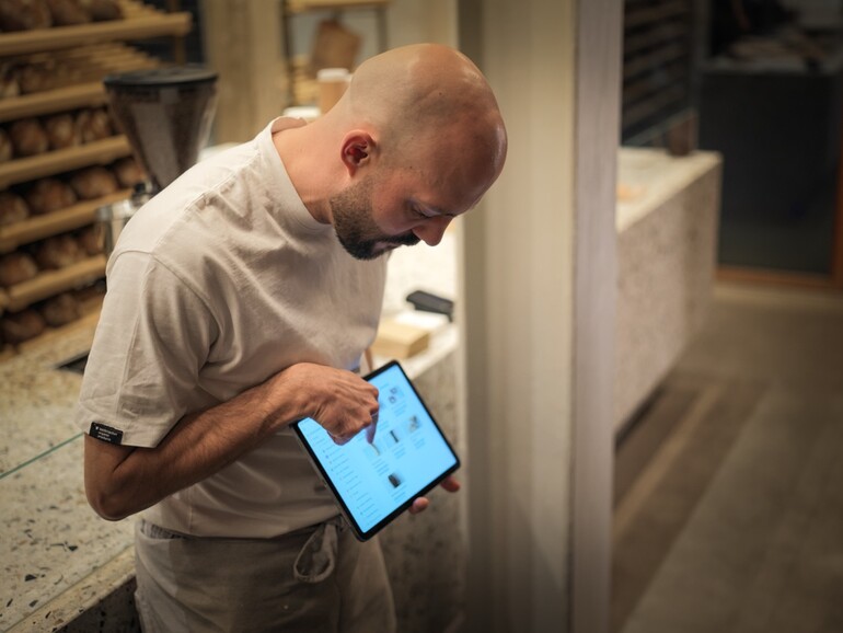 Brantner kennt die andere Seite: In früheren Stationen seines Arbeitslebens musste er mit billigeren Tablets und schwerfälliger Unternehmenssoftware arbeiten, die viel Einweisung verlangte und schnell an ihre Grenzen stieß. In seinem eigenen Betrieb setzt er bewusst auf eine überschaubare Kombination aus Apple-Hardware und wenigen, gut passenden Programmen. Manche, wie die App Kalibre, stammen sogar aus der eigenen Familie. Sein Bruder Vinzenz entwickelt diese speziell für die Bedürfnisse seiner Backstube weiter. Wir sind mit offenen Augen und Ohren sowie beständigen Nachfragen durch die wohlduftende Backstube gegangen, um Beispiele aus dem Arbeitsalltag zu finden.