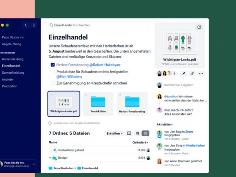 Ordnerübersicht: Dank der Beschreibungen im oberen Bereich Ihrer Ordner haben Sie wichtige Infos immer im Blick. Aufgaben und wichtige Dateien lassen sich außerdem schnell und einfach finden, egal ob auf dem Desktop, auf Mobilgeräten oder über dropbox.com.