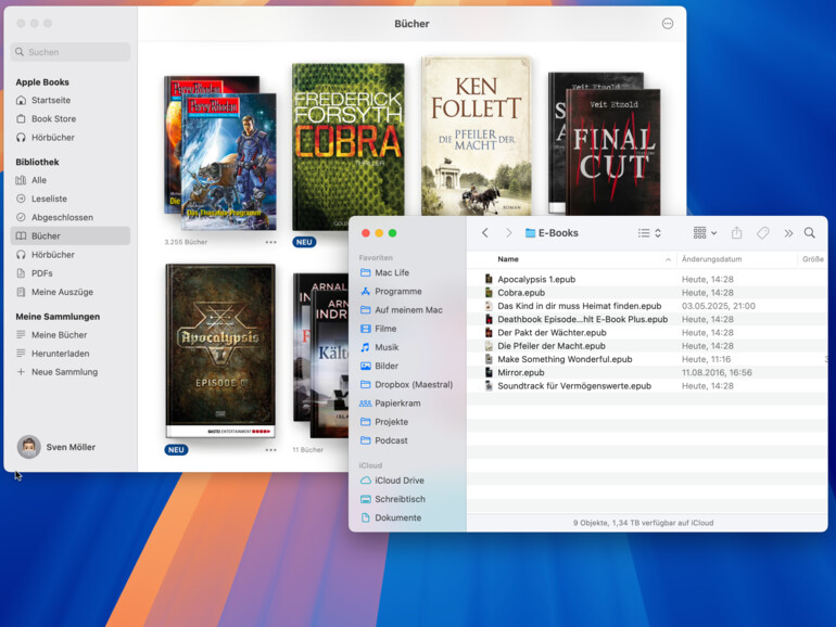 Die E-Books sind tief im System versteckt – in einem Container-Ordner innerhalb deiner Benutzer-Library. Anders als in der Musik-App kannst du in der Bücher-App nicht per Rechtsklick ein Buch im Finder anzeigen lassen. Auch die Option „Informationen“ verrät keinen Speicherort, wie das beim TV-Programm der Fall ist.