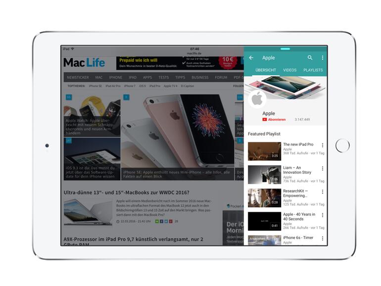 Viel interessanter ist daher Split View. Dies erlaubt dem Nutzer zwei Apps nebeneinander auszuführen. Auf der linken Seite kann man also im vollem Umfang im Web surfen, während zur rechten ab sofort Youtube-Videos laufen könnten. Allerdings sind die beiden Funktionen auf bestimmte iPads begrenzt. Slide Over funktioniert auf allen iPads ab dem iPad Air beziehungsweise dem iPad mini 2. Split View hingegen ist erst ab dem iPad Air 2 und dem iPad mini 4 oder verfügbar.