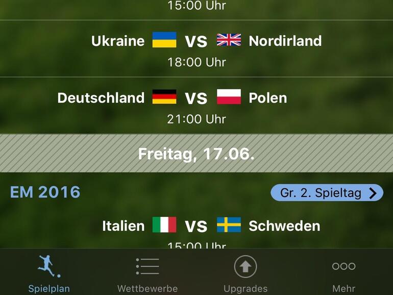 Was bei der offiziellen UEFA-App fehlt, wird hier nachgeliefert: ein offizieller übersichtlicher Fahrplan der anstehenden Spiele von der Qualifikation bis zum Turnier. Am Spieltag informieren dann Liveergebnisse. Per Upgrade lässt sich auch das Live-TV des Herstellers kaufen.