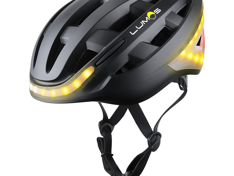 Der Fahrradhelm Lumos ist mit LEDs übersät, die das Fahren in der Dunkelheit sicherer machen sollen. Außerdem ist er ist Blinkern ausgerüstet. Ingesamt wurden zehn weißen LEDs auf der Vorderseite, 38 roten LEDs auf der Rückseite und 11 gelbe LEDs eingebaut.