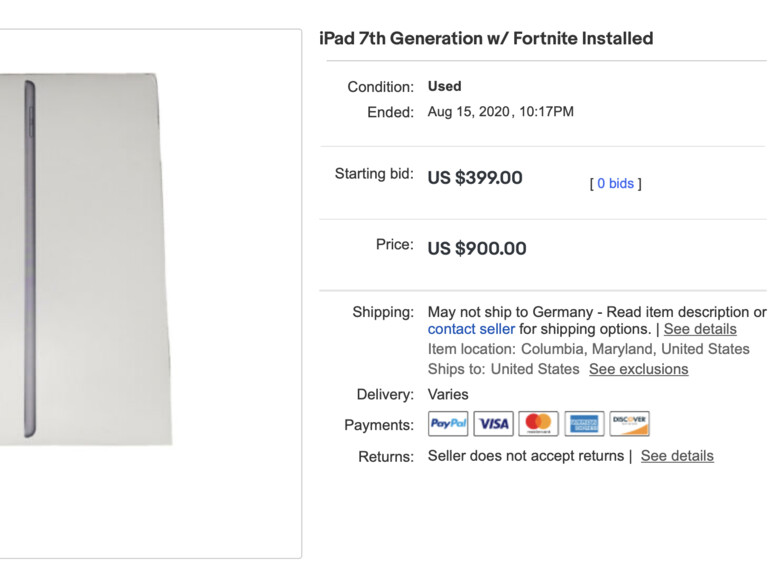Auch wenn das Angebot aktuell überschaubar ist, nimmt die Zahl langsam zu. Ein iPad (7. Generation) bot ein Nutzer etwa für schlappe 900 US-Dollar an, weil darauf Fortnite installiert ist. Dabei ist anzumerken, dass das Gerät sowohl gebraucht ist und nur die absolute Basisausführung darstellt, die über 32 GB Speicher verfügt und bereits für weniger als 350 Euro zu haben ist.