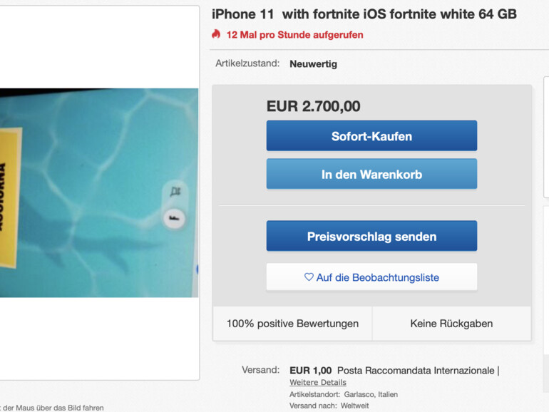 Auch ein iPhone XS Max in Gold mit 64 GB Speicher und Fortnite sowie einem Jailbreak lässt sich bei eBay finden. Hier verlangt man auf der Auktionsplattform schlappe 1.000 Euro. Deutlich teuerer lässt sich ein iPhone 11 mit 64 GB und dem Epic-Spiel finden. Als Sofort-Kaufen-Preis legt der Anbieter stattliche 2.700 Euro fest und mehr als verdreifacht damit den ursprünglichen Kaufpreis – für ein gebrauchtes Gerät wohlgemerkt.
