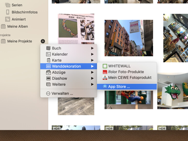Die Erweiterungen für Projekte helfen dir bei der Umsetzung von Fotobüchern, Kalendern, Karten, Postern und Kunstdrucken. Daneben können die erstellten Werke auch direkt bei Drittanbietern bestellt werden. Zuvor hatte Apple einen eigenen Dienst dafür, der allerdings im letzten Jahr eingestellt wurde.