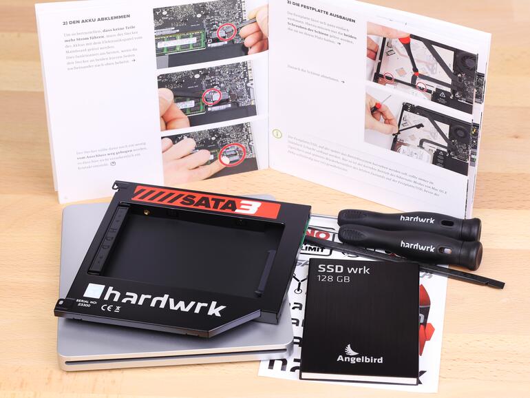 Dein MacBook Pro wird immer langsamer und du willst ihm schnell, sicher und kostengünstig so richtig Beine machen? Dann ist das Fusion-Drive-Bundle genau das Richtige für dich. Neben dem aktuellen SATA3-Adapter und der SSD wrk für Mac von Angelbird ist im hardwrk Fusion-Drive-Bundle alles enthalten, was du zum sorgenfreien Umbau und weiteren Betrieb deines MacBook brauchst. Die gedruckte Einbauanleitung führt dich Schritt für Schritt durch den Umbau – auch dann noch, wenn dein Rechner auseinandergeschraubt vor dir liegt.
