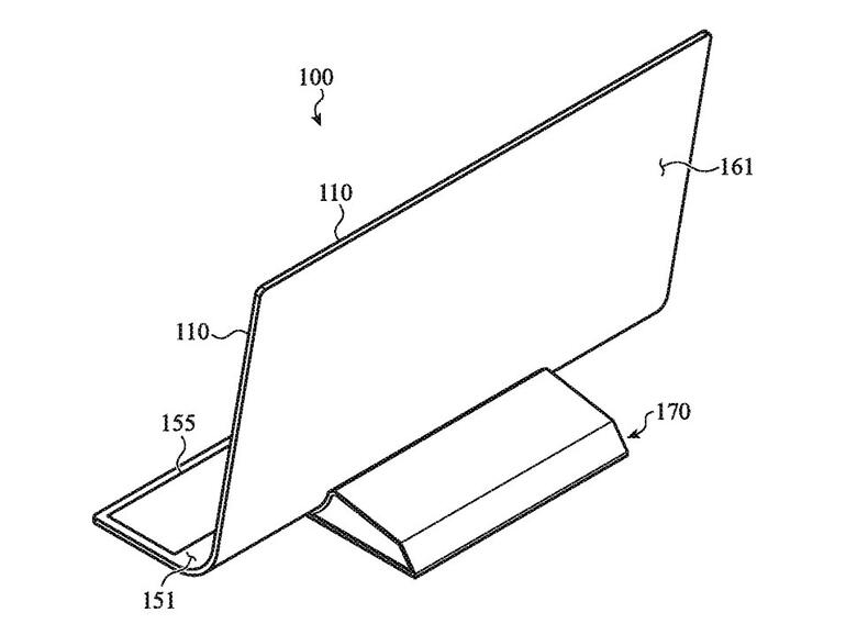 In seiner Grundform heißt es in dem Patent, bestünde der Mac aus einer Glasscheibe mit einem gebogenen unteren Teil an einer Kante, der auf dem Schreibtisch zur Aufnahme von Eingabegeräten verwendet wird, und einem größeren flachen Bereich, der den eingebetteten Bildschirm enthält.