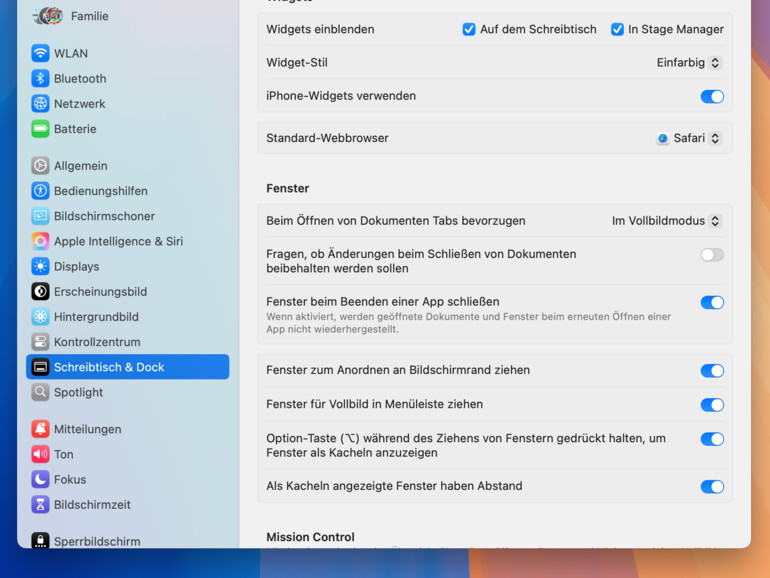In den Systemeinstellungen gibt es seit macOS Sequoia einen neuen Bereich: Klicken Sie in der Seitenleiste auf Apple Intelligence & Siri, um die neuen Optionen aufzurufen. Oben im Fenster können Sie Apple Intelligence aktiviere...