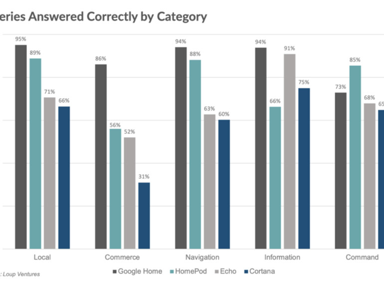 Wie schon im letzten Jahr führte die Website Loup Ventures einen sehr umfassenden Test mit den verschiedenen Sprachassistenten aus. Im Vergleich zum Vorjahr haben alle an Intelligenz zugelegt, während Siri nun auf dem HomePod angekommen ist und dadurch gleich in mehreren Bereichen wie dem „Verstehen“ ordentlich punkten konnte. Auch in diesem Jahr verglich man die Intelligenz der Sprachassistenten in fünf Kategorien (Lokal, Handel, Navigation, Information, Aufgaben) mit rund 800 Fragen. Dabei wurde jede Anfrage nochmals in zwei geteilt: 1. Hat der Assistent die Anfrage verstanden? 2. Wurde eine richtige Antwort ausgegeben?