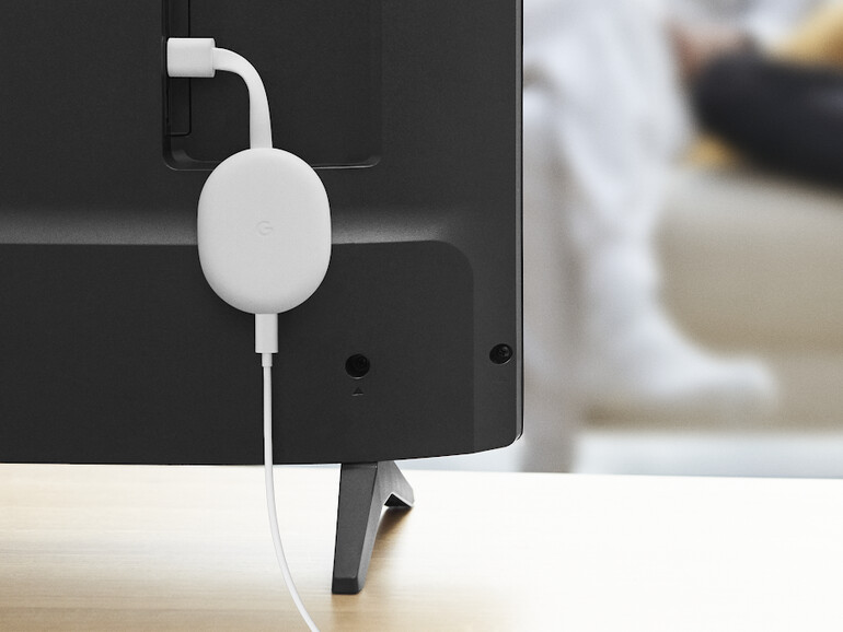 Leider hat Google beim Chromecast with Google das Design nicht geändert, es handelt sich immer noch um einen runden, weißen Puck, der per angehängtem Kabel an den HDMI-Eingang des TVs gesteckt wird. Strom braucht das Gerät auch noch. Auch zwei weitere Farben (orange und blau) wurden angekündigt.
