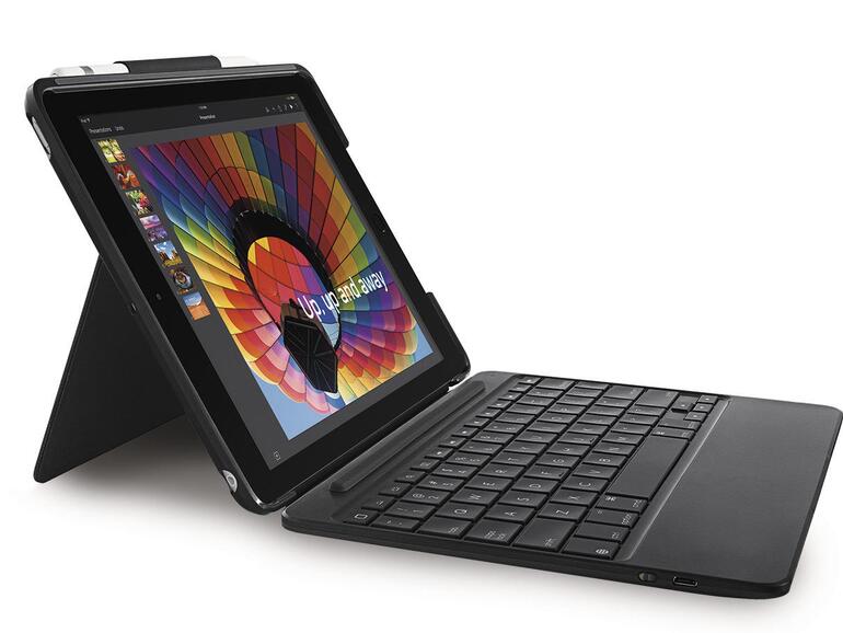 Dieses Cover mit Tastatur steht stellvertretend für eine ganze Reihe an Logitech-Produkten derselben Art. Die Slim Combo ist kompatibel zum älteren iPad Pro mit 10,5 Zoll. Es gibt aber auch Versionen für alle anderen iPad-Modelle.