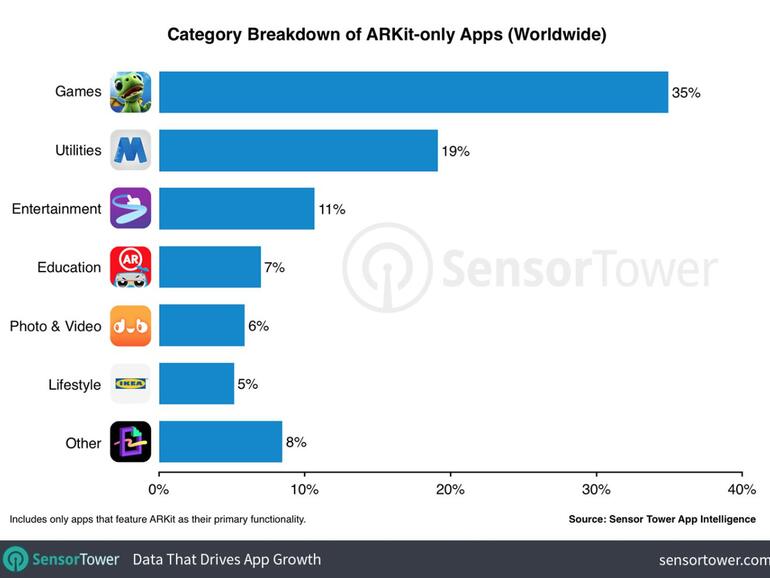 Nach dem ersten Monat dominieren vor allem Spiele die neue AR-Kategorie im App Store. Mit 35 Prozent machen Sie mehr als ein Drittel der verfügbaren AR-Inhalte aus. Nützliche Apps wie magicplan (virtuelles Maßband) bringen es hingegen auf 19 Prozent. Anschließend folgen Entertainment-Apps mit 11 Prozent, während Bildungsanwendungen derzeit nur etwa 7 Prozent der verfügbaren AR-Apps ausmachen.