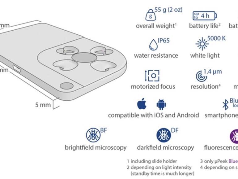 Als kommerzieller Ableger der Züricher Hochschule präsentiert die Firma Scrona mit „µPeek“ auf Kickstarter als erstes Produkt ein Aufsteck-Mikroskop für Smartphones mit 35 - 350-facher Vergrößerung. Kompatibel mit allen iPhone-Baureihen 4, 5 und 6 sowie etlichen Android-Geräten, ist µPeek nur 55 Gramm leicht und mit 57 mal 92 Millimetern minimal länger als eine Kreditkarte. „Das professionelle Mikroskop, das in deine Brieftasche passt“ wird bis zum 9. Januar 2016 auf Kickstarter finanziert und soll ab Juni für unter 200 Euro pro Stück angeboten werden.