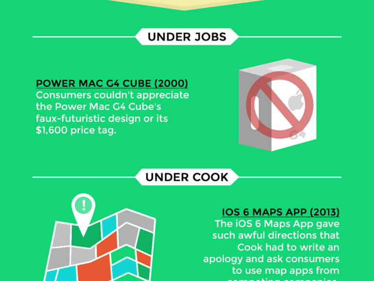 Dafür wurden unter Jobs zahlreiche wirklich neue Produkte lanciert, während es bei Cook nur wenige waren. Der größte Fehler unter Jobs' Führung war der Mac G4 Cube, der zu teuer war und dessen Design nicht gewürdigt wurde. Bei Cook war es der fatale Start von Maps in iOS 6. Doch auch die Ausbeutung chinesischer Arbeiter wurde Jobs vorgeworfen, während unter Cooks Führung Apple angeblich der NSA geholfen hat.