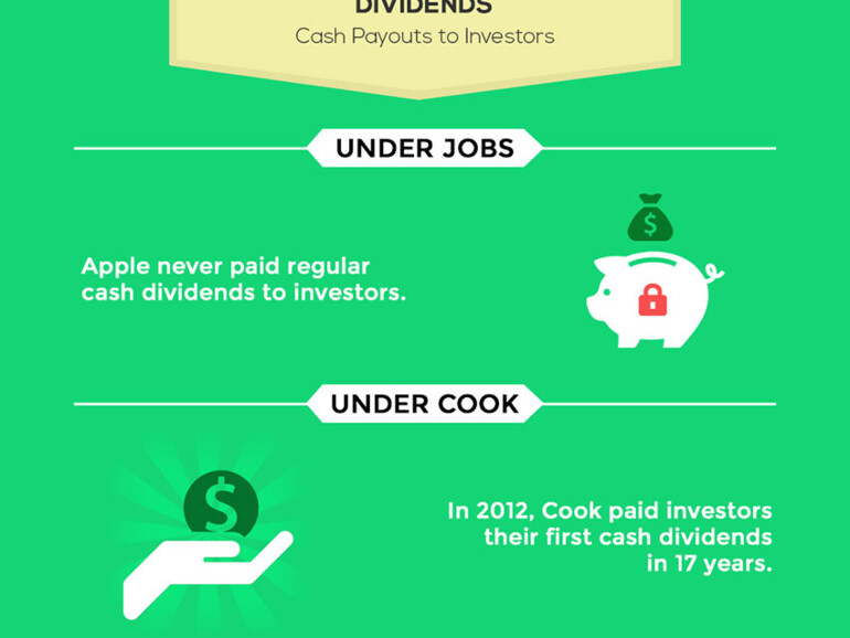 Dividenden an die Aktionäre zahlte Jobs' Apple nie, während Cook 2012 das erste Mal seit 17 Jahren eine Dividende auszahlen ließ. Zudem steigt der Kurs der Apple-Aktie unter Cook deutlich an.