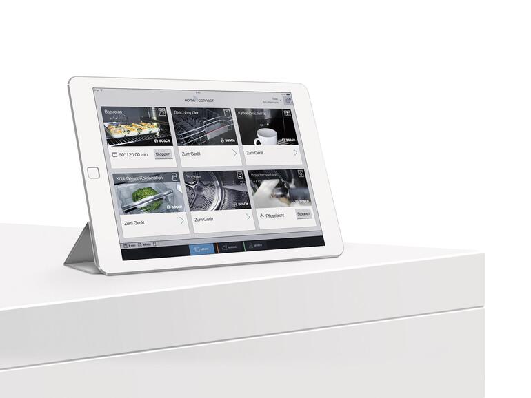 Für Home Connect nutzen Sie Ihr drahtloses Internet (WLAN), um die Bosch Hausgeräte mit Ihrem Smartphone oder Tablet zu vernetzen. Auf diese Weise brauchen Sie keinerlei zusätzliche Hardware, sondern lediglich ein Bosch Hausgerät mit Home-Connect-Funktion und die Home Connect App, die Sie für iOS (ab iOS 7) und Android (ab Android 4.1) gratis herunterladen können. Wichtige Features der Hausgeräte sind, wie beschrieben, dank Home-Connect-Funktion auch von unterwegs aus bedienbar. Der Datenaustausch ist dabei geschützt und entspricht hohen Sicherheitsstandards. Zudem wurde die Sicherheit durch TÜV Trust IT bestätigt. Weitere Informationen finden Sie online auf den Seiten der Herstellers unter www.bosch-home.de.