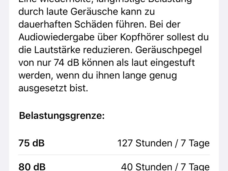 Zusätzlichen zu den Umgebungsgeräuschen achtet Apple auch auf die Lautstärke Ihrer Kopfhörer, da auch diese die Hörgesundheit beeinflussen kann. Dabei kategorisiert man die in Dezibel gemessene Lautstärke in „OK“ und „Laut“. „OK“ stellt dabei eine Lautstärke von unter 80 Dezibel dar. Apple zufolge kann aber auch ein Pegel von 75 Dezibel schädlich sein, wenn man ihm für längere Zeit innerhalb einer Woche ausgesetzt ist. Eine umfassende Statistik dazu können Sie in der Health-App unter „Hören > Kopfhörer-Geräuschpegel“ einsehen. Laut Apple erfolgt die beste Messung des Kopfhörer-Geräuschpegels mit Apple- oder Beats-Kopfhörern.