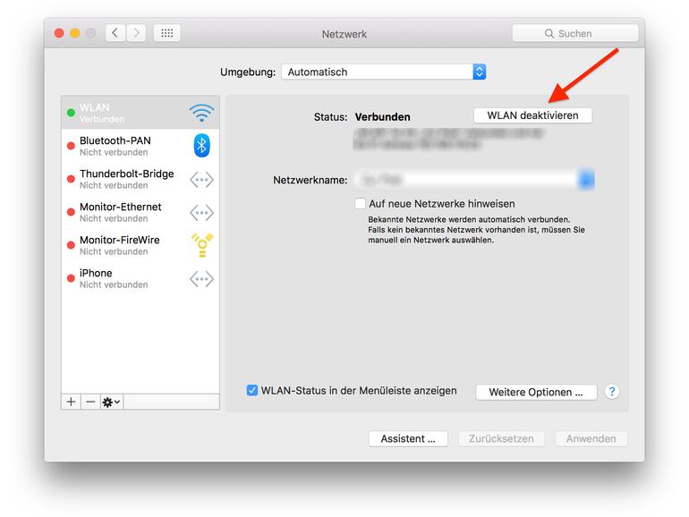 Schritt 2: Wähle zuerst "Netzwerk" aus und klicke darin auf "WLAN deaktivieren".