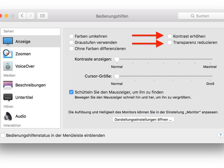 Schritt 4: Die besonders die Optionen "Kontrast erhöhen" und "Transparenz reduzieren" können die Akkulaufzeit deines Macbook etwas verlängern.