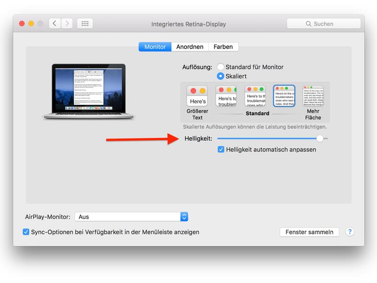 Schritt 3: Passe die Helligkeit über den Schieberegler im Reiter "Monitor" an. Alternativ lässt es die Mac-Tastatur standardmäßig zu, dass man über die F1- und F2-Tasten die Helligkeit regelt.