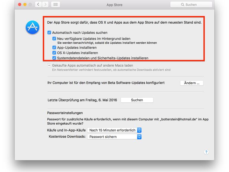 Schritt 3: Entferne in den App-Store-Einstellungen die Haken vor den verschiedenen Updates, aber du solltest den Haken bei "Systemdatendateien und Sicherheits-Updates installieren" unbedingt gesetzt lassen.