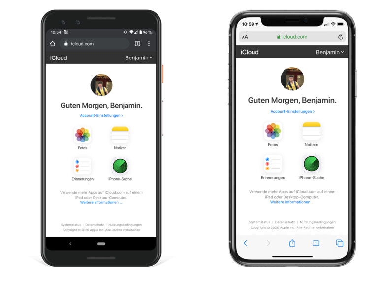 Verwendet man hingegen ein Tablet wie das iPad, dann werden zusätzliche Anwendungen wie Kontakt, Mail, Kalender, Freunde und iCloud Drive sichtbar. Während am iPad automatisch die Desktopseite geladen wird, lässt sich dies am iPhone leider nicht erzwingen, sodass der Zugriff trotz angeforderter Desktopansicht auf die vier Anwendungen begrenzt bleibt. Es ist unklar, weshalb Apple Smartphone-Nutzer auf diese Weise einschränkt und nicht einmal Zugriff auf die Kontakte gewährt.