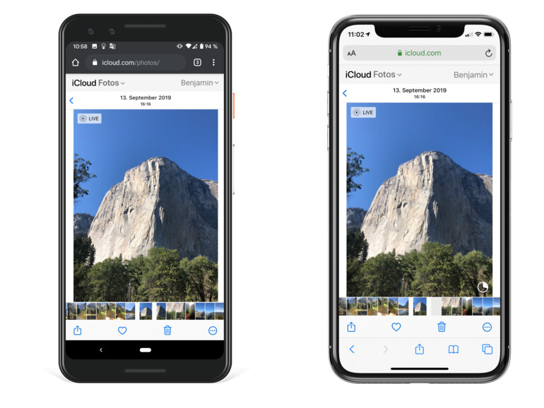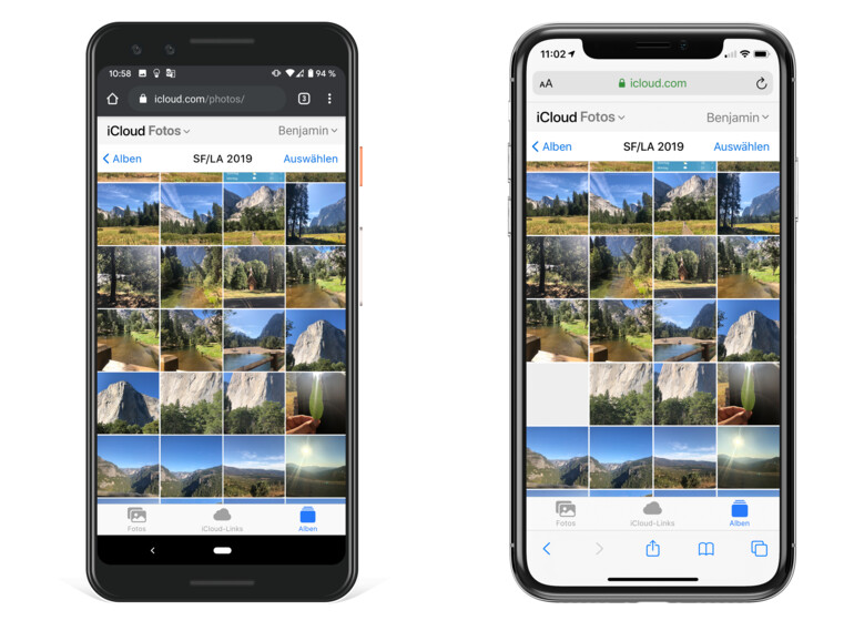 Die neue Fotos-Web-App orientiert sich stark an der iOS-Vorlage und wird per Navigationsleiste durch die Menüs „Fotos“, „iCloud-Links“ und „Alben“ ergänzt. Eine Suchfunktion fehlt hingegen. In Alben lassen sich sowohl erstellte Alben als auch einzelne Medientypen öffnen – wie in der Fotos-App an iPhone und iPad. Intelligente Features wie „Personen & Orte“ fehlen allerdings.