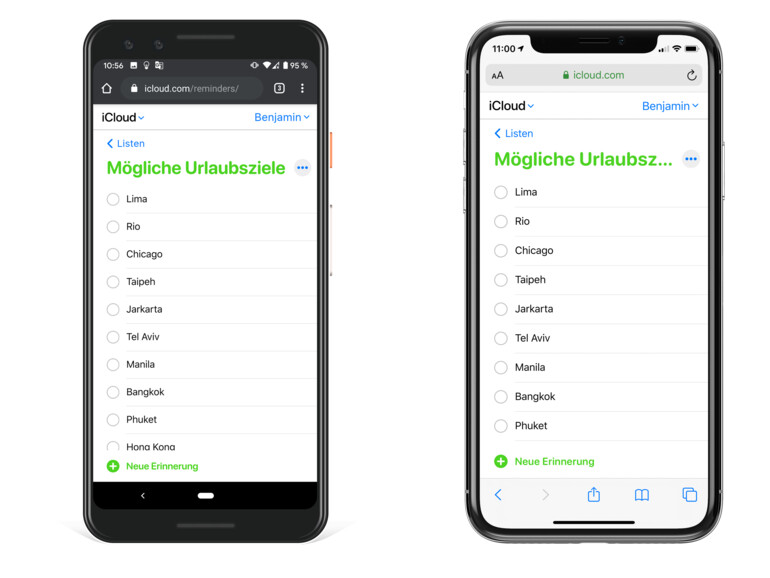 Apples Wahl bei den verfügbaren Web-Apps für Smartphone-Nutzer ist interessant. Vor allem „Erinnerungen“ erscheint dabei unglücklich gewählt, während sich „Kalender“ oder „Kontakte“ als sinnvollere Alternativen eignen. Optisch ist die Auflistung der Erinnerungslisten im Stile der App gehalten, zeigt jedoch nicht die Anzahl der Elemente an. Außerdem fehlen auch die neuen Optionen „Heute“, „Geplant“, „Alle“ und „Markiert“. Übrigens lassen sich auch keine neuen Listen, sondern nur einzelne Erinnerungen erstellen.