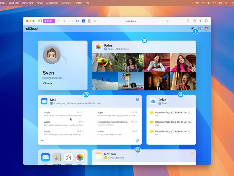 Auf der Startseite lassen sich Online-Versionen zahlreicher Apple-Apps wie Notizen, Fotos, Mail, Erinnerungen, Kalender und Kontakte öffnen. Auch Pages, Numbers und Keynote stehen bereit, um neue Dokumente zu erstellen oder bestehende zu bearbeiten. Über iCloud Drive hast du Zugriff auf deine gespeicherten Dateien, kannst diese öffnen, verwalten oder neue hinzufügen. Die Mail-App erlaubt dir, E-Mails zu lesen, zu beantworten oder neue Nachrichten zu verfassen.