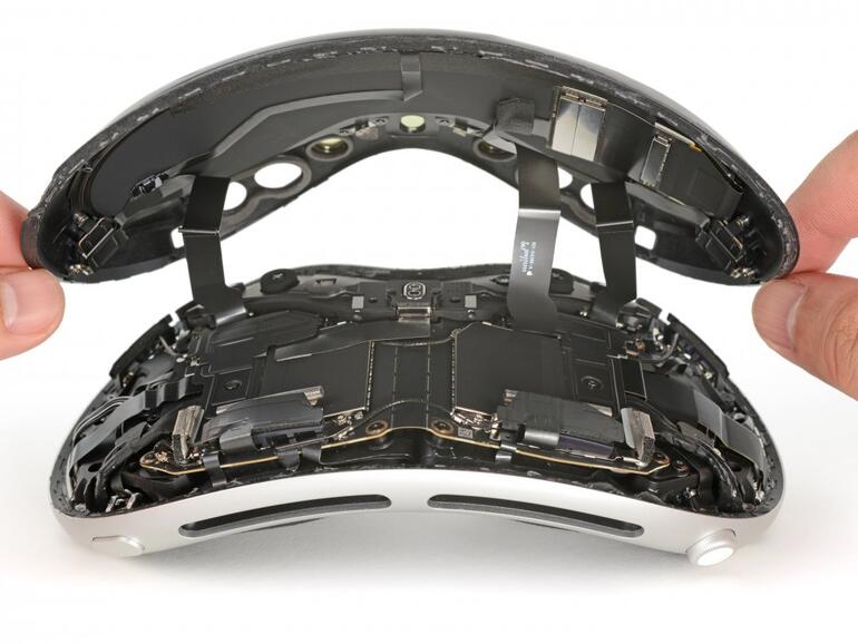 Die Lautsprecher und Gesichtspolster hingegen lassen sich leicht austauschen, so iFixit. Unterhalb des Außendisplays befinden sich dann die Optikeinheiten und die Kühlung in Form von zwei Lüftern. Im Inneren befinden sich eine Vielzahl von Kabeln und Schrauben – ungewöhnlich viel Material für ein Apple-Produkt. Aus Platzgründen musste auch das Motherboard in zwei Teile aufgeteilt und mit einem Flachbandkabel verbunden werden.