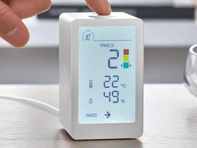 Der Vindstyrka Raumluftqualitätsmonitor misst Feinstaub (PM2.5), Luftfeuchtigkeit, Temperatur und Gesamtgehalt an flüchtigen organischen Verbindungen (TVOC). Das Gerät gibt eine Bewertung auf dem Display mit grünen, gelben und roten Stufen ab, um zu zeigen, wie gesund oder ungesund die Raumluft ist.
