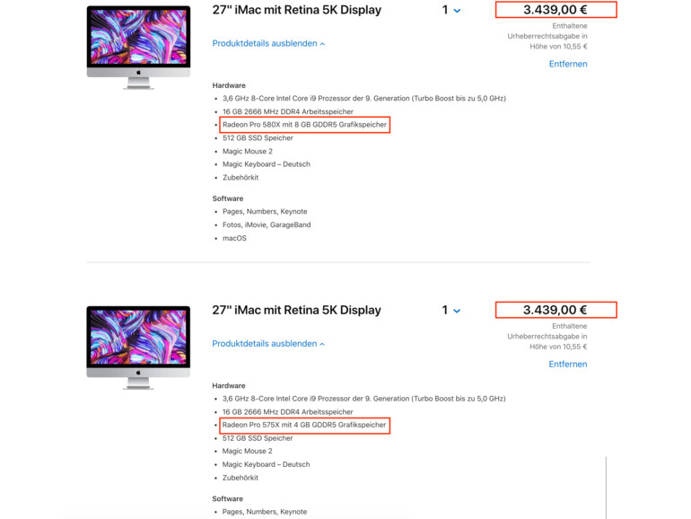 Der iMac mit 27-Zoll-Display ist in drei Basisausführungen verfügbar. Jede lässt sich anschließend noch etwas anpassen. Doch bei einer bestimmten Kombination passiert etwas Interessantes. Nehmen Sie etwa das Modell für 2.299 Euro und konfigurieren es mit dem 3,6 GHz 8-Kern Intel Core i9 Prozessor, 16 GB Arbeitsspeicher und der 512 GB SSD, dann kostet die Variante 3.439 Euro mit der Radeon Pro 575X mit 4 GB GDDR5 Grafikspeicher.