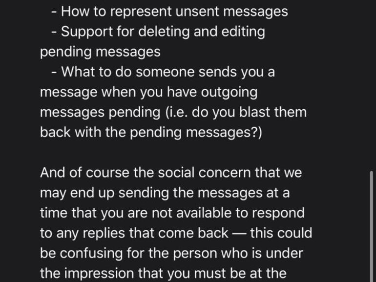 Diese Informationen erhielt er von keinem Geringerem als Apples Software-Chef Craig Federighi auf Anfrage per E-Mail. Laut Federighi überlegte Apple eine entsprechende Funktion für iMessage anzubieten und überlegt auch weiterhin. Dem Apple-Manager zufolge ist die Umsetzung jedoch alles andere als einfach. Einige mögliche Probleme müssen hierbei gelöst werden. Dazu führt er drei Punkte an: