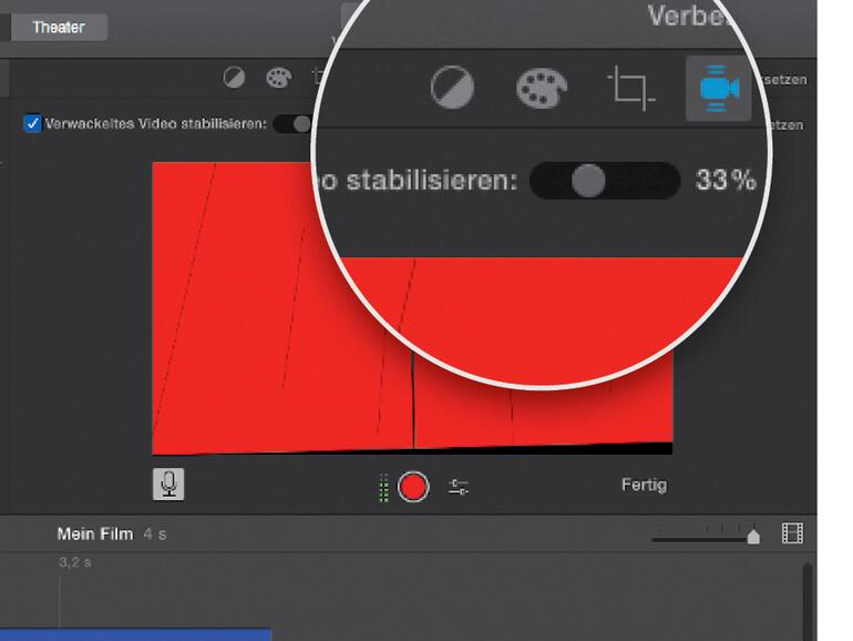 Im Monitor-Fenster finden Sie ein kleines Kamera-Symbol. Damit öffnen Sie die Einstellungen zur Bildstabilisierung. Sie haben anschließend zwei Optionen. Mit Verwackeltes Video stabilisieren macht iMovie genau das, was es verspricht. Über den Schieberegler verändern Sie die Stärke der Stabilisierung. Den unschönen Rolling-Shutter-Effekt können Sie ebenfalls korrigieren.
