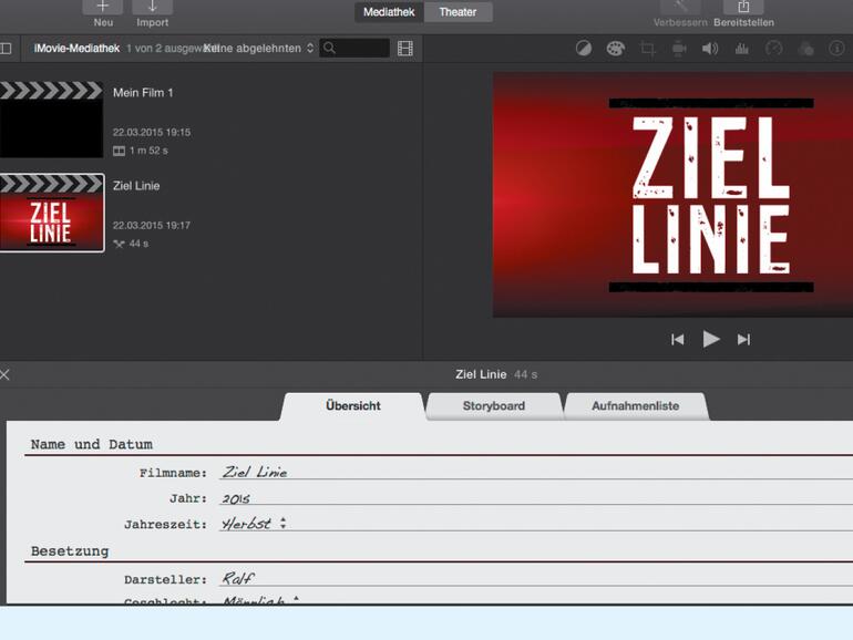 Sie müssen anschließend in der Übersicht lediglich Angaben zum Abspann machen. In der Storyboard-Ansicht sehen Sie die einzelnen Abschnitte und Texteinblendungen. Über die Aufnahmeliste fügen Sie einzelne kleine Clips zu Ihrem Trailer hinzu. Die iMovie-Anwendung gibt Ihnen Hinweise, wie die Clips aussehen sollen.