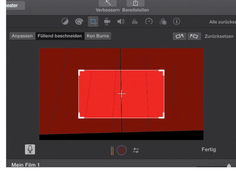 Es erscheint ein durchsichtiges Rechteck über Ihrem Video-Bild. Dieses können Sie an den Ecken größer oder kleiner ziehen. Mit einem Klick auf den kleinen Haken beschneiden Sie das Bild auf die Größe des Rechtecks.