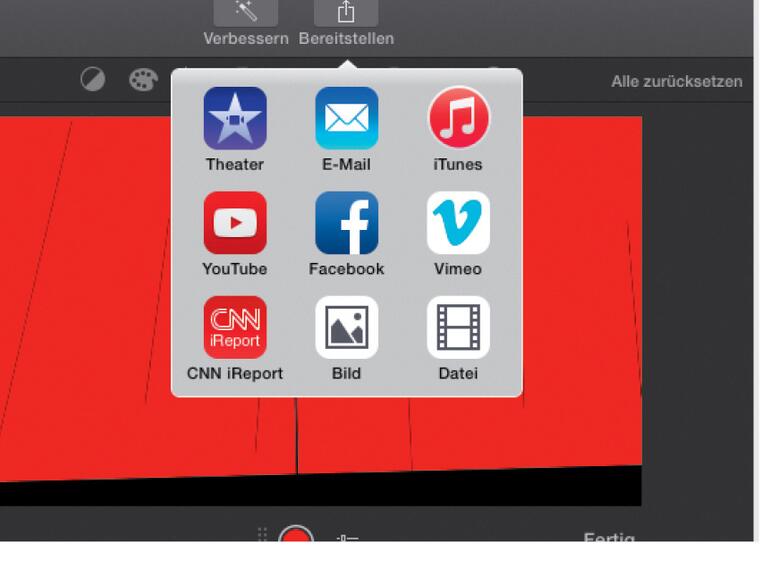 Für den Eigenbedarf exportieren Sie das Ergebnis direkt zu iTunes. Alternativ erstellen Sie aus dem aktuellen Frame eine eigenständige Bild-Datei. Oder Sie exportieren Ihr Video als Datei und speichern es auf Ihrer Festplatte.