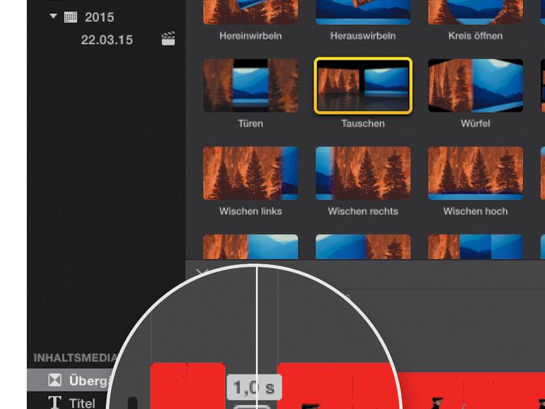 Wählen Sie einen Übergang aus und ziehen Sie diesen mit gedrückter Maustaste auf Ihre Timeline. Lassen Sie die Auswahl anschließend zwischen zwei Clips fallen. Damit haben Sie den Übergang hinzugefügt. Mit einem Doppelklick auf den Übergang können Sie weitere Einstellungen vornehmen.