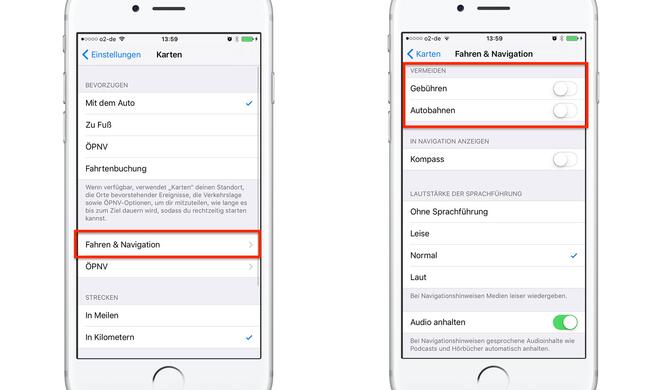 Ebenfalls in der Einstellungs-App zu finden, sind Einstellungen für die Karten-App, die sich massiv auf die Routenplanung auswirken können. Dabei kann man auswählen, ob Maut-Straßen oder Autobahnen gemieden werden sollen. Wir hoffen hierbei auf eine Verlagerung in die Karten-App, sodass man nicht immer nachsehen muss, ob eine Option ein- oder ausgeschalten ist.