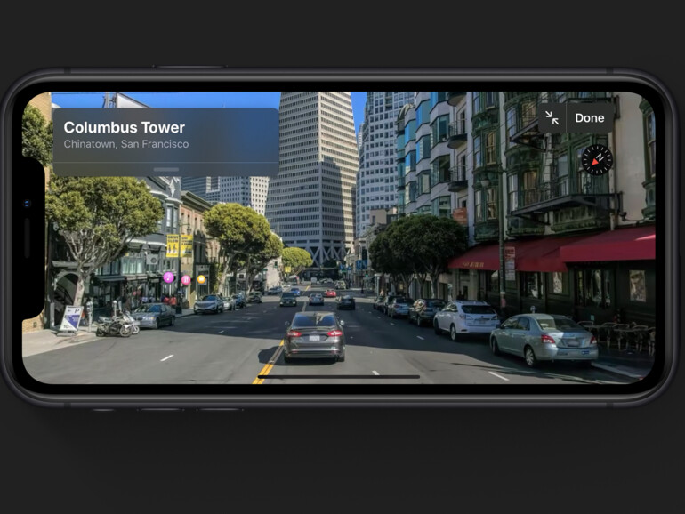 Die Karten-App baut Apple stückweise neu auf, sodass in den USA in diesem Jahr neues detaillierteres Kartenmaterial bereitsteht. Dazu schickte Apple zahlreiche Fahr- und Flugzeuge los, um neue Daten zu sammeln. Die Fahrzeuge machten zusätzliche Fotoaufnahmen, sodass Apple mit iOS 13 eine eigene Alternative zu Google Street View zur Verfügung stellen wird. Apple nennt dies allerdings „Umsehen“ und ist vorerst nur für Apples heimischer Bay Area verfügbar.