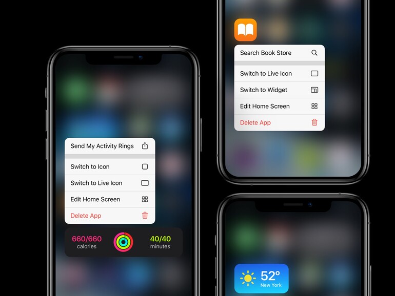 Die Wetter-App könnte entsprechend Temperatur, Ort und Wetterlage anzeigen, während die Kamera-App eine Schnellauswahl des Kamera-Modus bietet. Allgemein könnte Apple dadurch umfassende Funktionen anzeigen und anbieten, um diese schneller in den Apps zu erreichen.