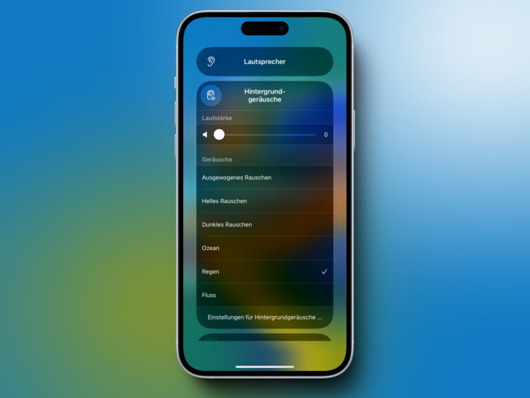 Bereits mit iOS 15 eingeführt, ermöglicht die Funktion „Hintergrundgeräusche“ das Abspielen von Ambient-Sounds auf dem iPhone, um Fokus oder Entspannung zu unterstützen. Zu den bereits verfügbaren Geräuschen gehören Ausgewogenes Rauschen, Helles Rauschen, Dunkles Rauschen, Ozean, Regen und Fluss.
