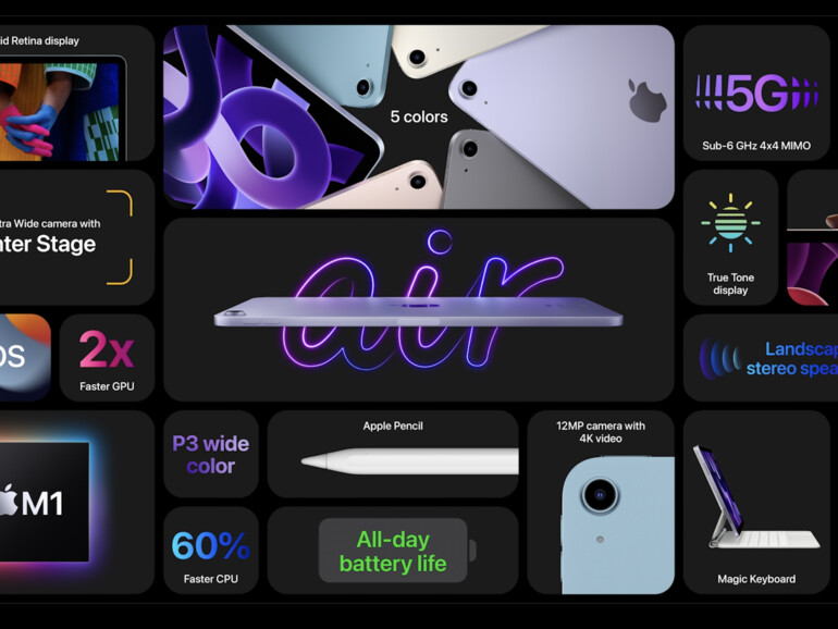 Wie auch beim Vorgängermodell des iPad Air kommt die neue Version mit insgesamt fünf neuen Farben. Dabei handelt es sich um Space Grey, Starlight, Pink, Purple und Blue.
